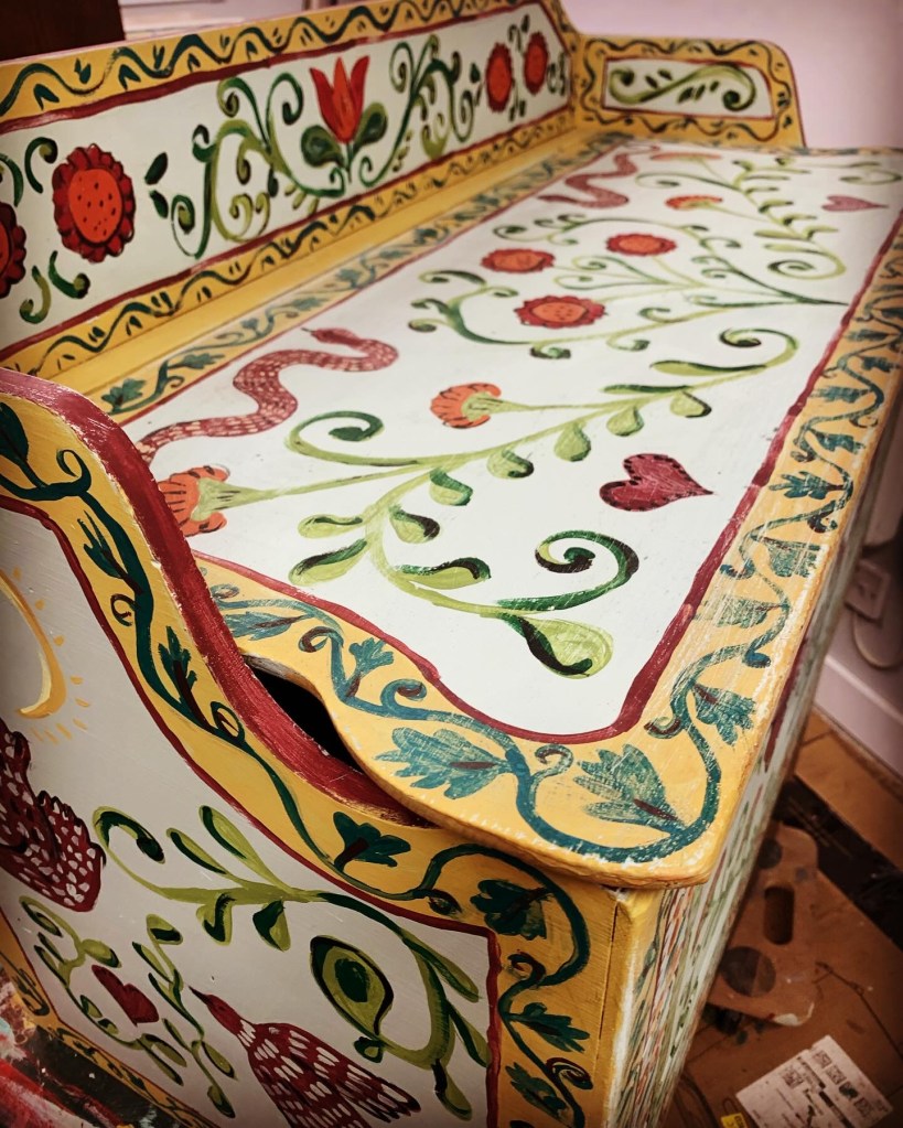 Hand painted upcycled furniture inspired by folk and nature