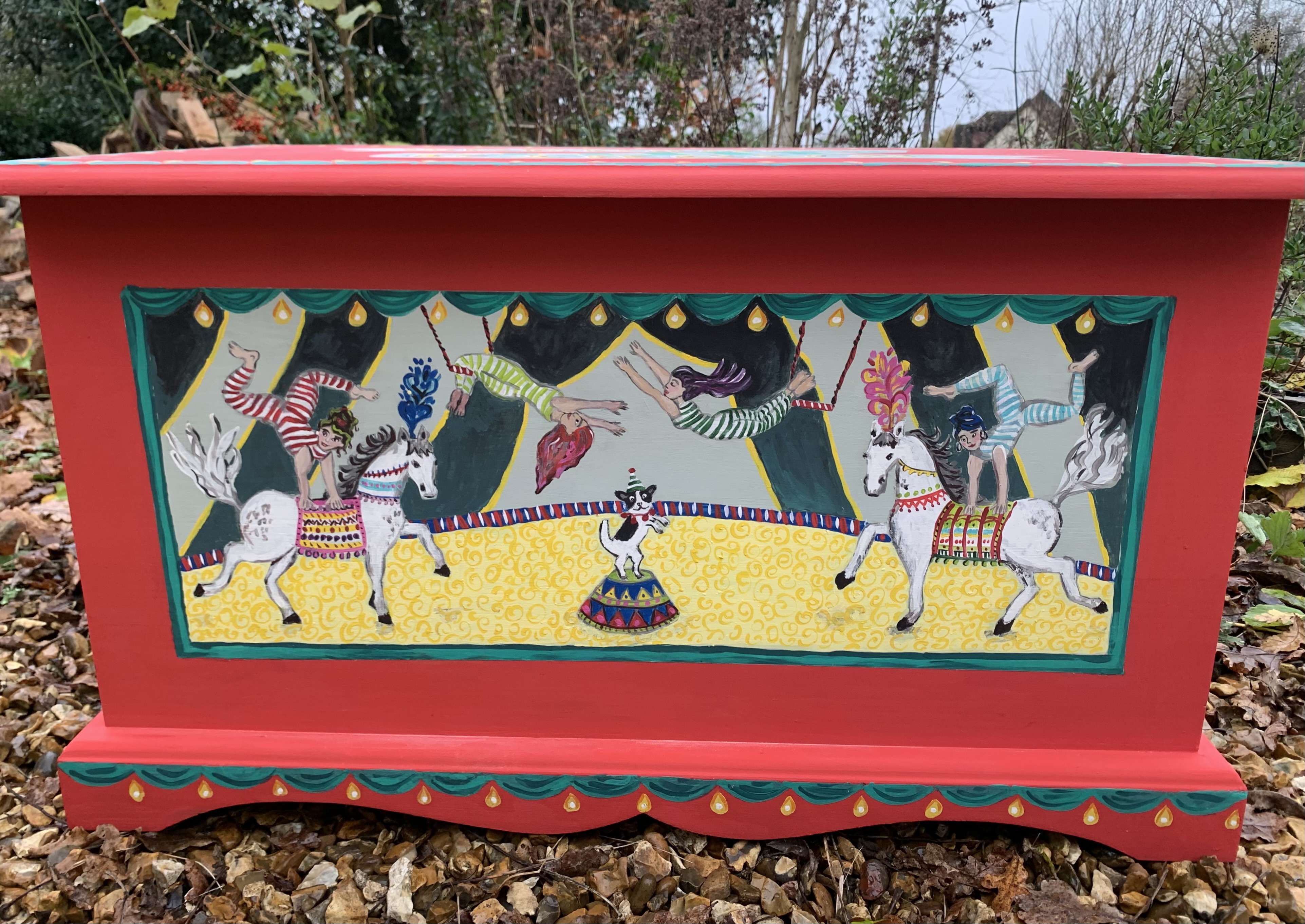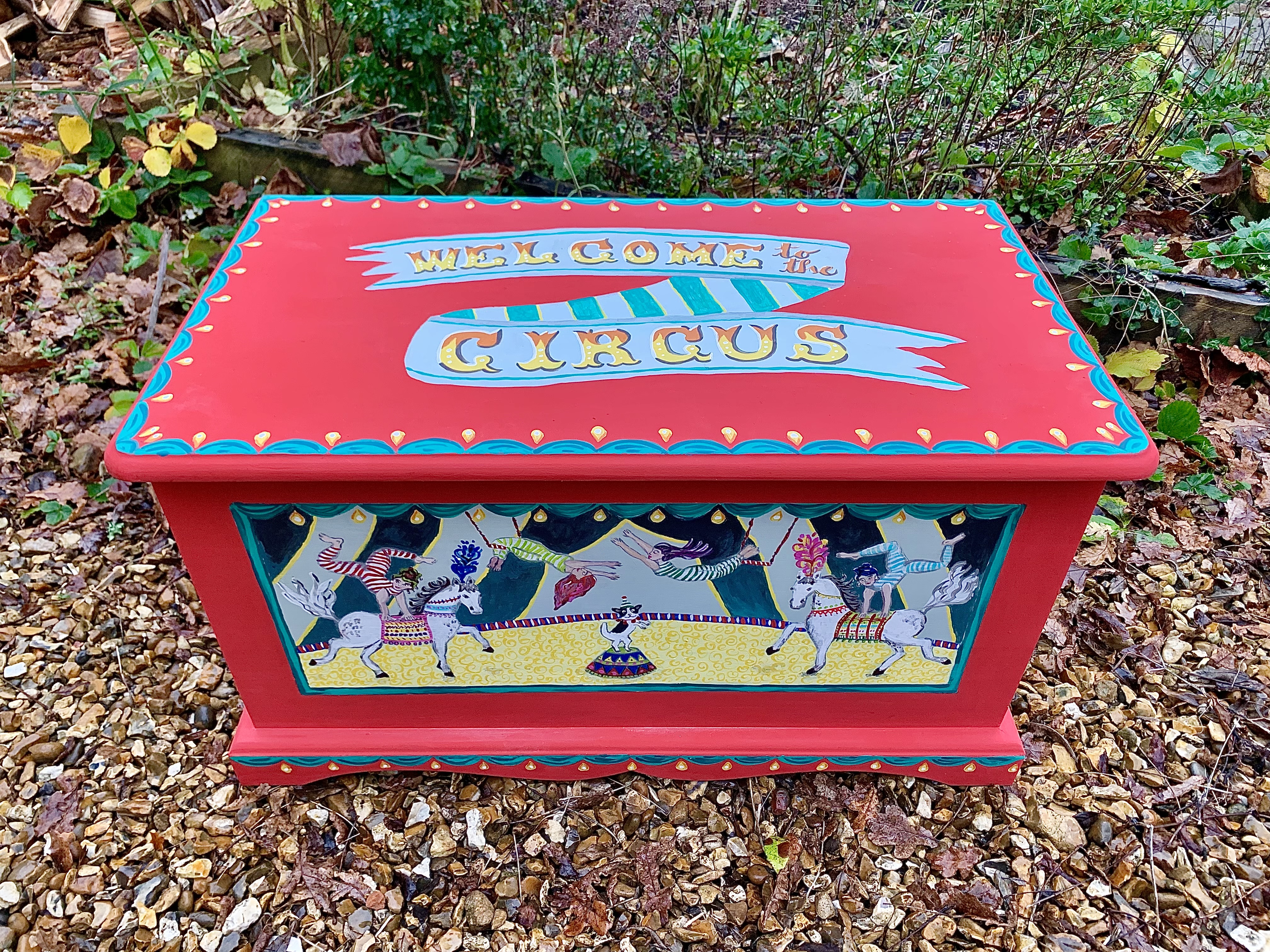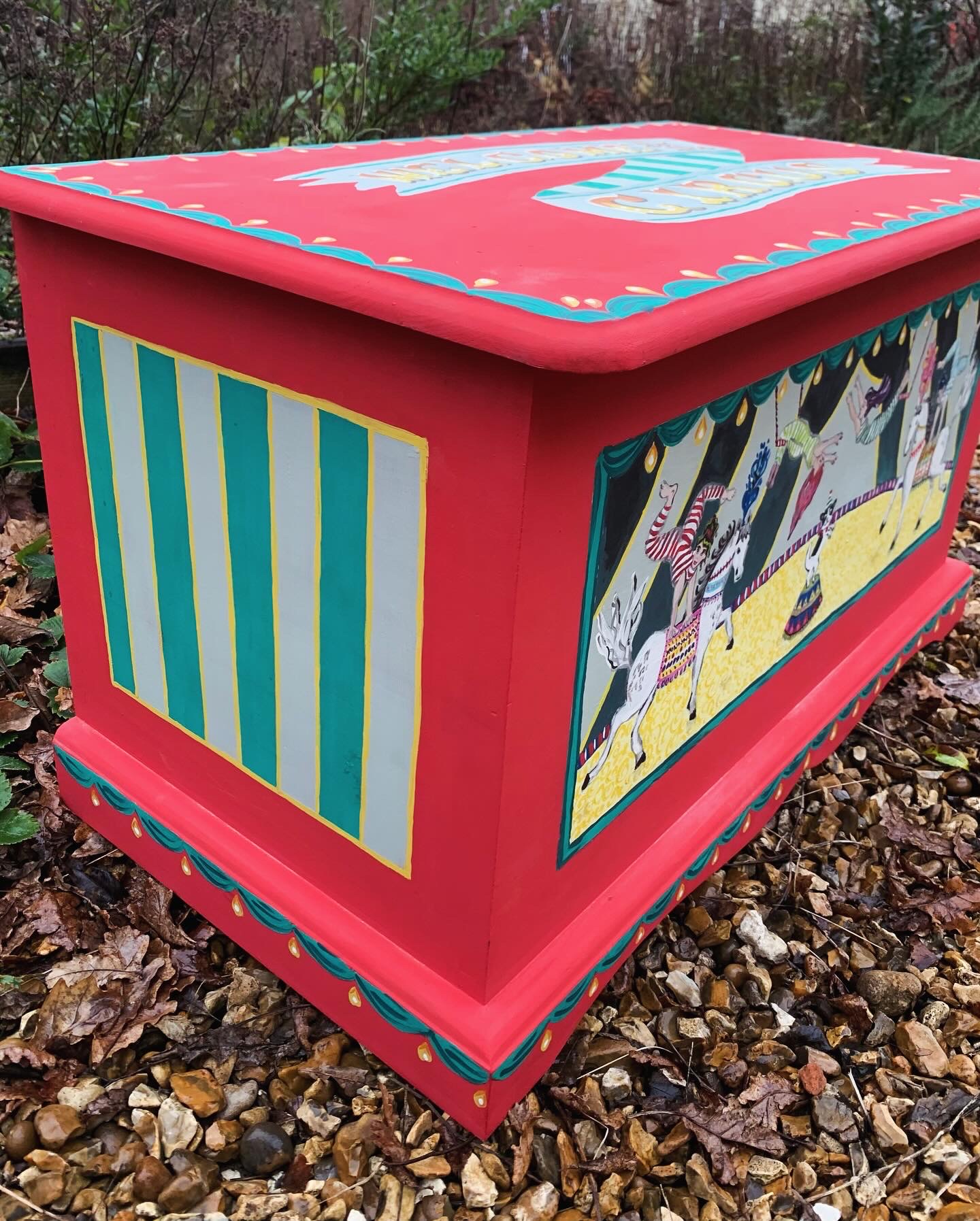 Sturdy pine box hand painted in a circus theme.