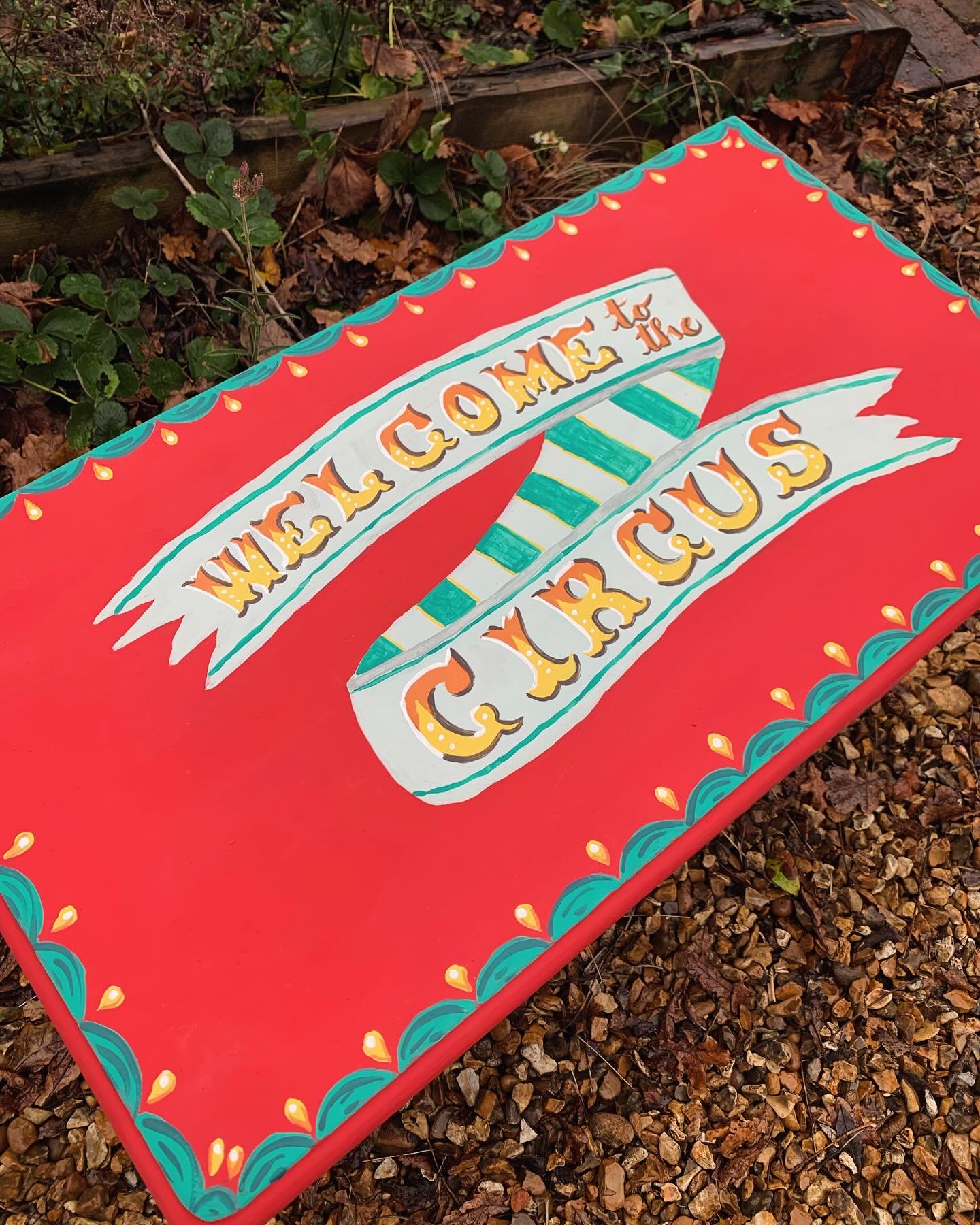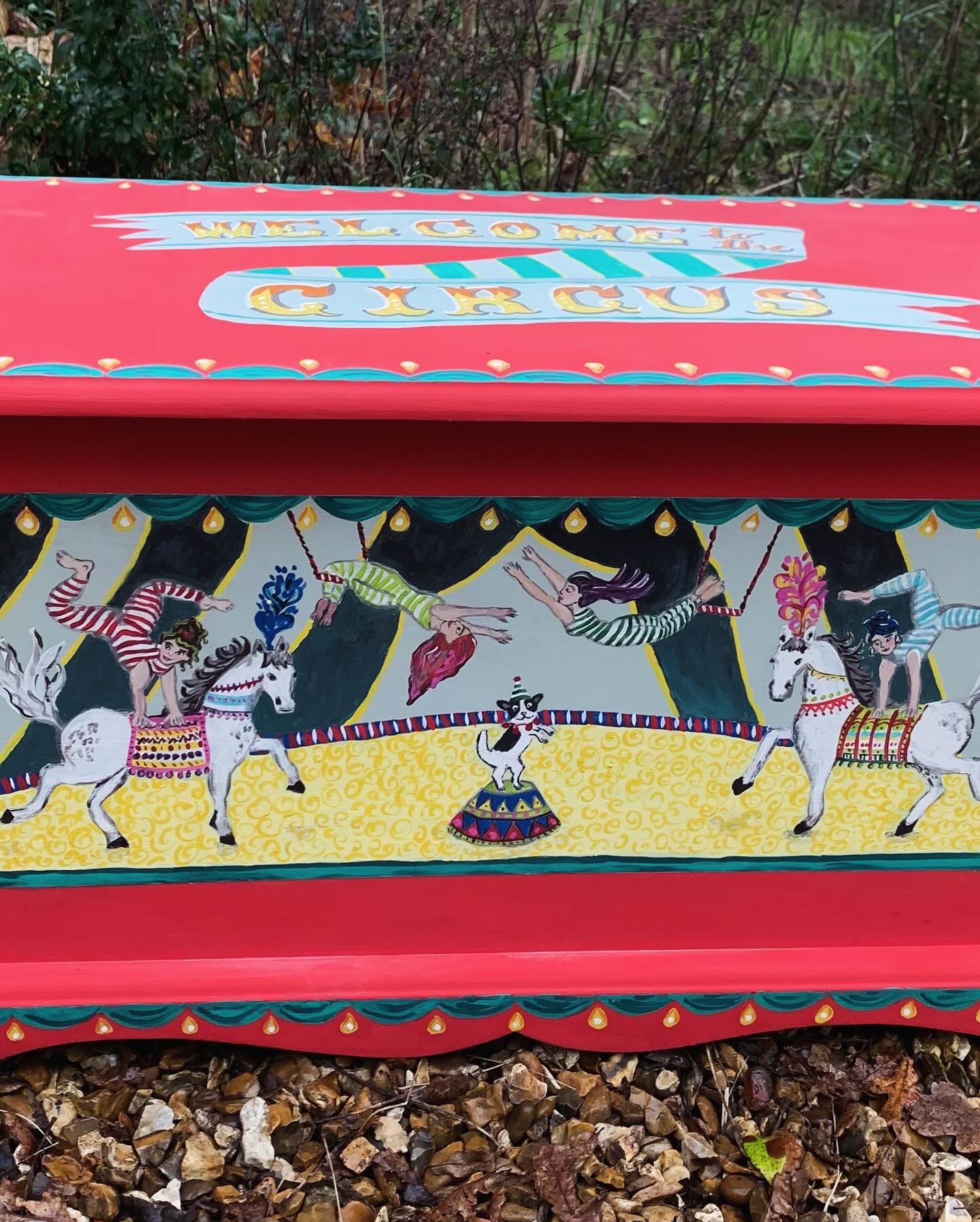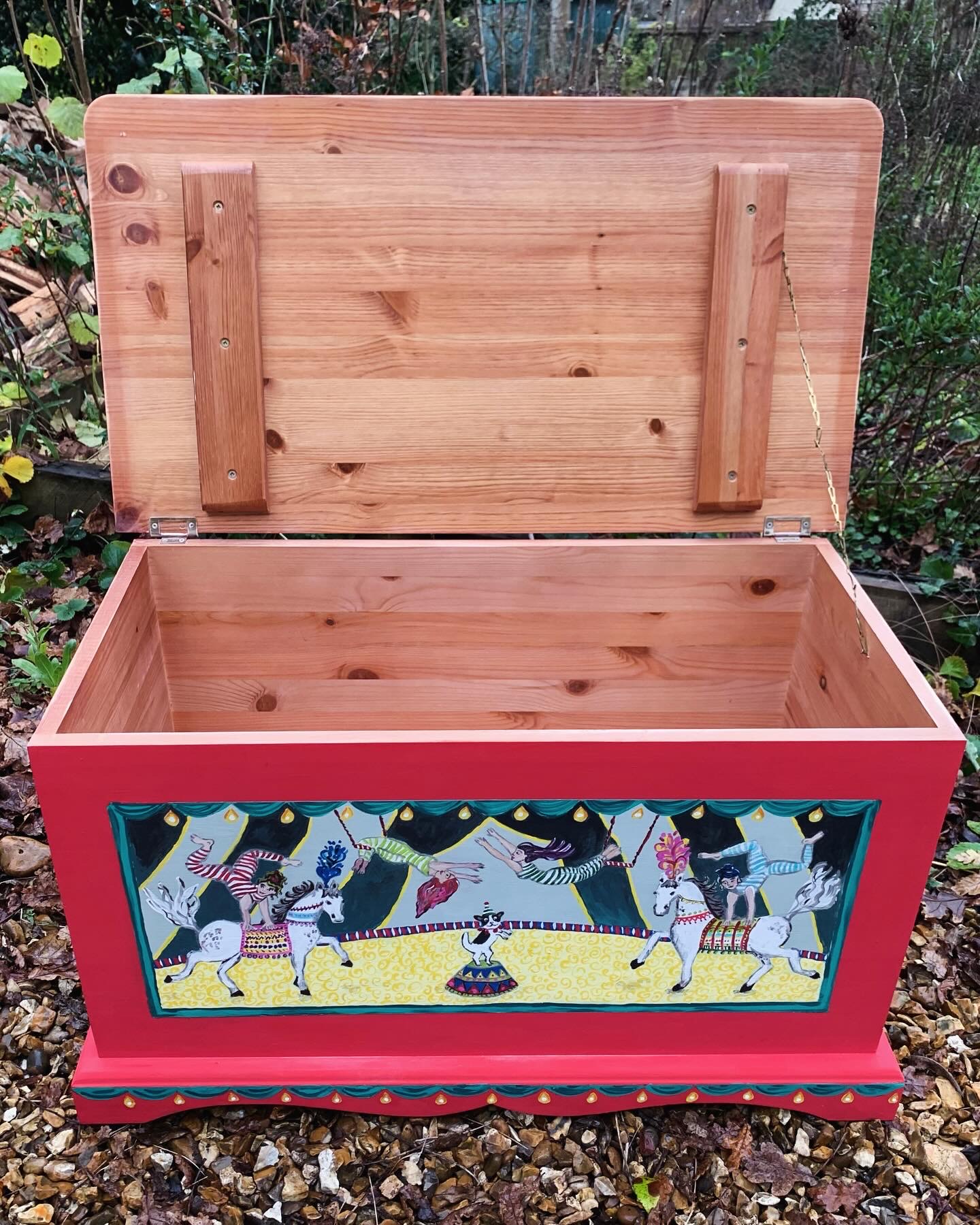 Sturdy pine box hand painted in a circus theme.